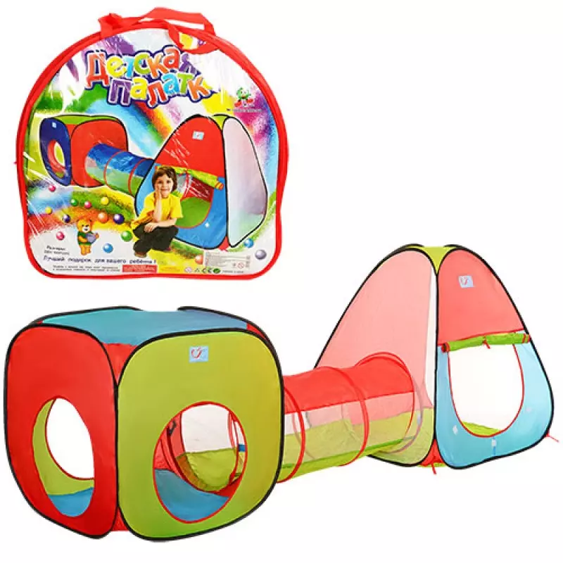 Намет з тунелем - кращий намет для дітей. Можна грати відразу всім комплектом, і окремо. Чудова іграшка, яка знадобиться і взимку для активних ігор в будинку, і влітку ? на вулиці, на природі. Якщо спекотне сонце, то намет захистить вашу дитину від сонця. Намет з тунелем зручно і компактно складається в сумку. Просто зберігати і переносити. Одним словом, море задоволення. Завдяки своїм габаритам в наметі одночасно може гратися кілька діточок. Кожна дитина мріє про свій затишний куточок, де можна сховатися від усіх і пограти з улюбленою іграшкою, почитати книжку або просто посидіти та помріяти про щось. Саме для таких цілей і служить ігровий намет. 4 входи - сітка (1 - з накидкою на липучці, 3 круглих отвори) Проста в установці і легко складається МАТЕРІАЛ: Виконано виріб з якісного водонепроникного поліестеру і сітчастого матеріалу. РОЗМІР: 230 ? 78 ? 91 см