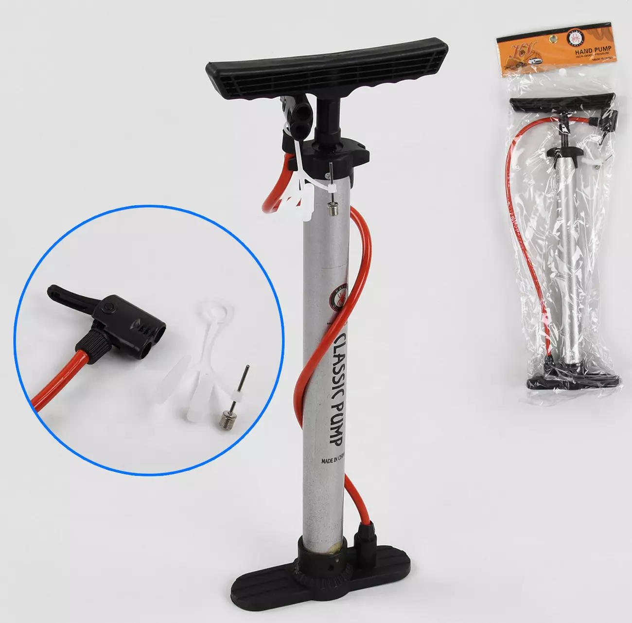 Насос підлоговий C 44608 - ідеально підходить для накачування велосипедних коліс, м'ячів, надувних матраців і надувних іграшок. Характеристики: - алюмінієвий корпус; - шланг з натуральної гуми; - пластмасові ніжки; - адаптери для зручності прикріплені до шлангу; Матеріал ручки: пластик; Довжина насоса: 48 см; Довжина шланга: 55 см.