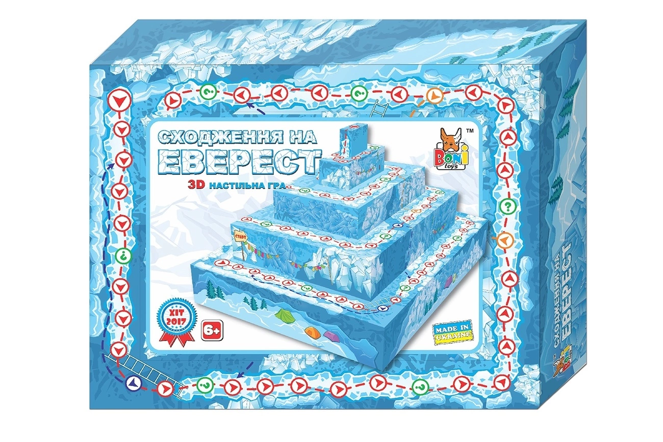 Настільна гра «Сходження на гору Еверест» ? це тематична гра з цікавою конструкцією,що захоплює з перших секунд. В процесі гри дитина дізнаватиметься інформацію про Еверест і розвиватиме логіку, пам’ять, наочно-образне мислення, фантазію, а також вміння аналізувати. Граючи в парі, дитина вчиться здобувати навики спілкування з партнером по спільному «ділу». А також гартує витримку, відчуття перемоги-поразки. Перед початком гри учасники обирають ведучого. Кількість гравців - 2-4 особи. У кожного має бути фішка і прапорець одного кольору. Гравці кидають кубик по черзі і просувають свою фішку вперед по ігровому полю на стільки кружечків, скільки очок випало на кубику. Перемагає той, хто дійде до фінішу першим (зупиниться на останньому кружечку і встановить на вершині гори свій прапорець). Конструкція ігрового поля: 1-й ярус ігрового поля в зібраному вигляді 400х320х70 мм; 2-й ярус ігрового поля в зібраному вигляді 310х230х50 мм; 3-й ярус ігрового поля в зібраному вигляді 220х140х50 мм; 4-й ярус ігрового поля в зібраному вигляді 105х50х50 мм; 5 -й ярус ігрового поля в зібраному вигляді 50х20х40 мм; ігрові фішки – 4 шт., прапорці – 4 шт., ігровий кубик – 1 шт., інструкція – 1 шт. Опис Габаритний розмір коробки: 400х320х70 мм Вікова категорія : 6+ Кількість гравців: від 2-х до 4-х учасників