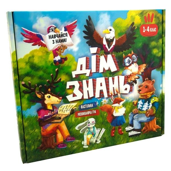 Великий будинок, в кожній квартирі, якого живуть забавні мешканці - тварини, які люблять ставити цікаві запитання, чекають малюка в настільній грі «Будинок знань». Гра для компанії до 6 осіб - зможе зацікавити не тільки дітей, а й дорослих, дасть можливість цікаво провести час всій родині, при цьому проявити свої здібності і отримати нові знання. Відповідно до очок, що випали на кубику, гравці пересувають фішку на ігровому полі, на якому є багато завдань, загадок і підказок, які роблять гру ще цікавіше. Ігрове поле прикрашене барвистими малюнками із зображеннями мешканців будинку. В процесі гри необхідно відповісти на питання звіряток, розгадати загадки і подолати перешкоди. Питання на картках різні - з області математики, спорту, зоології та казок. Перемагає той, хто першим прийде до фінішу - набравши максимальну кількість очок за правильні відповіді! Гра допоможе в навчанні і розвитку дитини. Правильні відповіді на питання наведені в спеціальній Книзі знань. Правила прості, але гра захопить учасників з першої партії. Перед початком гри велике ігрове поле необхідно зібрати - воно виконано у вигляді пазла. Мова українська. Вік: 6 Кількість учасників: від 2 до 6; Матеріал: картон; Комплект: ігрове поле, кубик, 120 карток з питаннями, 6 жетонів, відповіді на питання, інструкція.
