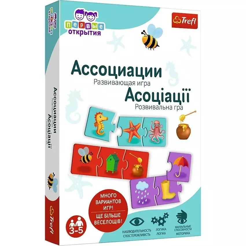 <p><em>Асоціації це унікальна розвиваюча гра-головоломка для дошкільнят, яка навчить їх називати й групувати предмети та події. Дитина поєднує елементи головоломки і пізнає світ, розважаючись. Розвиває спостережливість, логі та моторику рук.</em></p><p><em>Серія "Перші відкриття" - лінійка розвивальних ігор для дітей 3-5 років. Кожна гра була розроблена таким чином, щоби поєднувати навчання та веселощі.</em></p><p><em>Вміст коробки:</em></p><ul><li><em>24 пазли із трьох елементів</em></li><li><em>інструкція із низкою варіацій гри</em></li></ul><p><span></span></p>