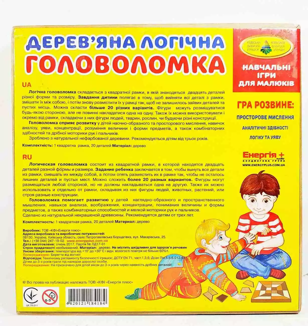 Логічна головоломка складається з квадратної рамки, в якій знаходяться двадцять детелей різної форми та розміру. Завдання дитини полягає в тому, щоб вийняти всі деталі з рамки, змішати їх між собою, і потім знову розмістити їх у рамці так, щоб не залишилось зайвих деталей та пустих місць. Можна скласти більше 20 різних варіантів. Фігури можуть розміщуватися будь-якою стороною, але не повинні накладатися одна на одну. Також їх можна використовувати і окремо від рамки, складаючи з них фвгури людей, тварин,рослин, чи будуючи різні конструкції. Комплектність: 1 квадратна рамка, 20 деталей. Матеріал: дерево.
