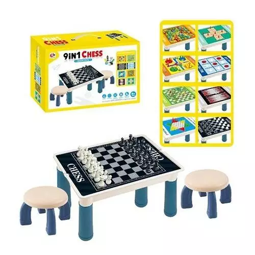 Настільна гра S5513 9в1, столик 38-28-29,5 см., стілець, шахи, шашки, фішки, кор., 43-29-11,5 см.