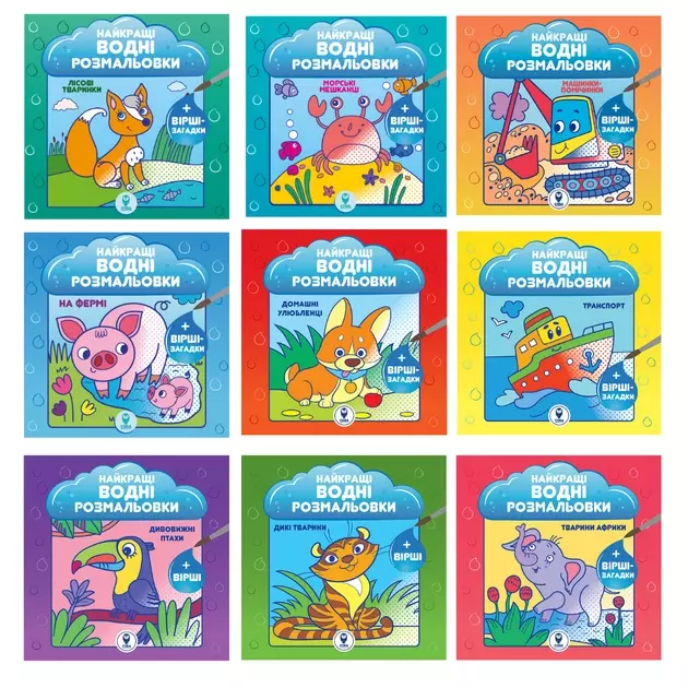 Серія Найкращі водні розмальовки перетворить малюків на справжнього чарівника! Прикрасити малюнки звичайною водою? Це просто! Потрібно лише обережно нанести пензликом воду на сторінку та зображення стануть кольоровими. Тупкий папір не розмокає під час малювання. Кожен малюнок зроблений із спеціальним відступом, щоб сторінку можна було відрізати. Так малюки не переживатимуть, що наступні сторінки намокнуть чи склеяться. А ще можна познайомитись із героями розмальовки, прочитавши вірші. Водні забарвлення - це цікаве заняття, яким малюки можуть займатися самостійно! Домашні тварини Транспорт Дивні птахи Дикі тварини Тварини Африки Лісові тварини Морські жителі Машинки-помічники На фермі