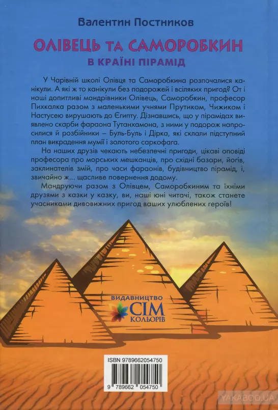 Пригоди маленьких чарівників - художника Олівця і майстра Саморобкина - продовжуються! Цього разу наші герої разом зі своїми друзями - Прутиком, Чижиком, Натусею і професором Пихкалкою вирушають до країни пірамід, де на них чекають цікаві відкриття і знахідки. Автор Валентин Постніков Видавництво Сім кольорів Мова Українська Рік видання 2018 Перекладач Н. Кир`ян Ілюстратор Анатолій Єлісеєв Кількість сторінок 192 Ілюстрації Кольорові Формат 165х245 мм Палітурка Тверда Папір Офсетний ISBN 978-966-2054-75-0 Вага 350 гр. Тип Паперова