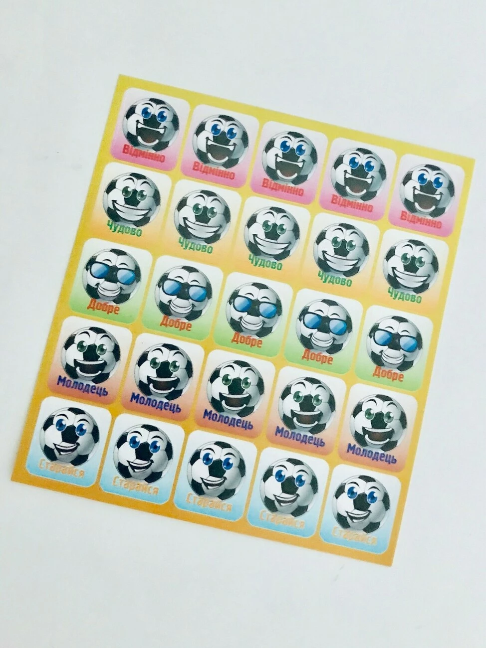 Малюки в садку і початковій школі не отримують повноцінних оцінок, а так хочеться похвалитися власними досягненнями у навчанні перед друзями і батьками. Тому вчителі можуть мотивувати і підбадьорювати своїх вихованців і учнів такими чудовими наклейками-оцінками. 25 наклейок з малюнками кубків позначають оцінки відмінно, відмінно, добре, молодець і красиво. Дітям буде цікаво дивувати наставників своїми знаннями і колекціонувати такі позитивні наклейки.