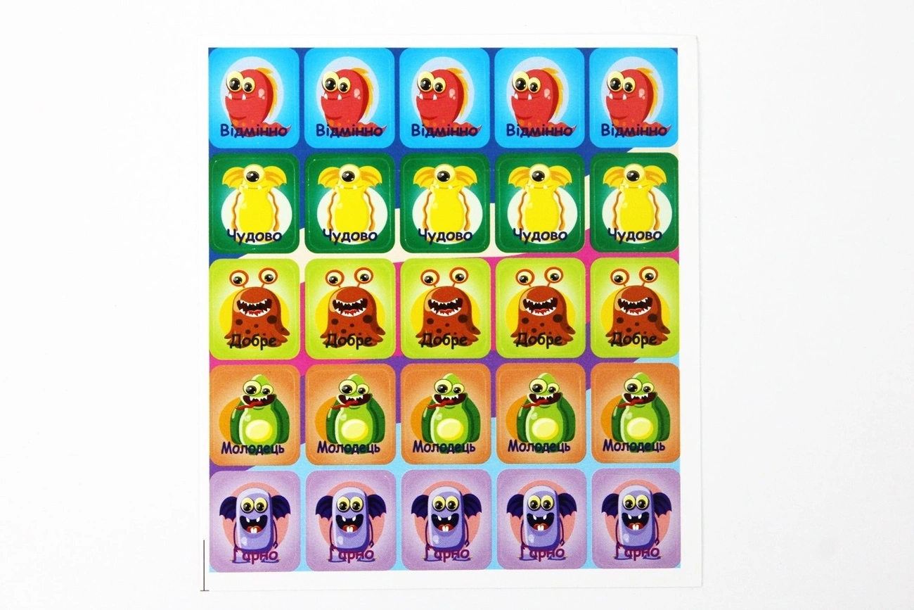 Малюки в садку і початковій школі не отримують повноцінних оцінок, а так хочеться похвалитися власними досягненнями у навчанні перед друзями і батьками. Тому вчителі можуть мотивувати і підбадьорювати своїх вихованців і учнів такими чудовими наклейками-оцінками. 25 наклейок з малюнками кубків позначають оцінки відмінно, відмінно, добре, молодець і красиво. Дітям буде цікаво дивувати наставників своїми знаннями і колекціонувати такі позитивні наклейки.