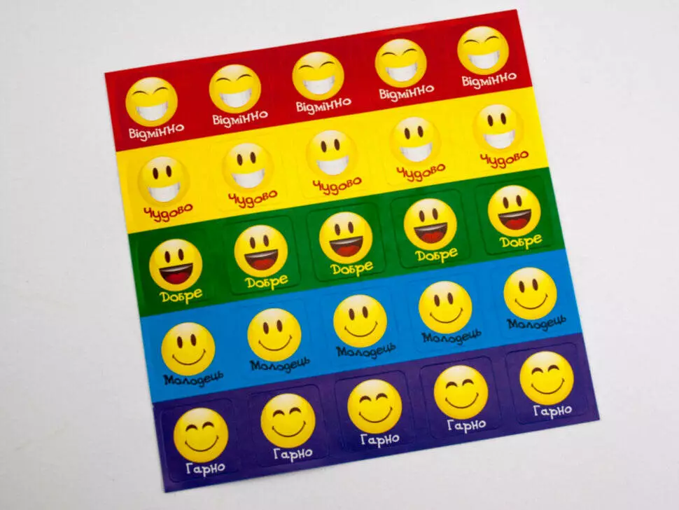 Малюки в садку і початковій школі не отримують повноцінних оцінок, а так хочеться похвалитися власними досягненнями у навчанні перед друзями і батьками. Тому вчителі можуть мотивувати і підбадьорювати своїх вихованців і учнів такими чудовими наклейками-оцінками. 25 наклейок з малюнками кубків позначають оцінки відмінно, відмінно, добре, молодець і красиво. Дітям буде цікаво дивувати наставників своїми знаннями і колекціонувати такі позитивні наклейки.