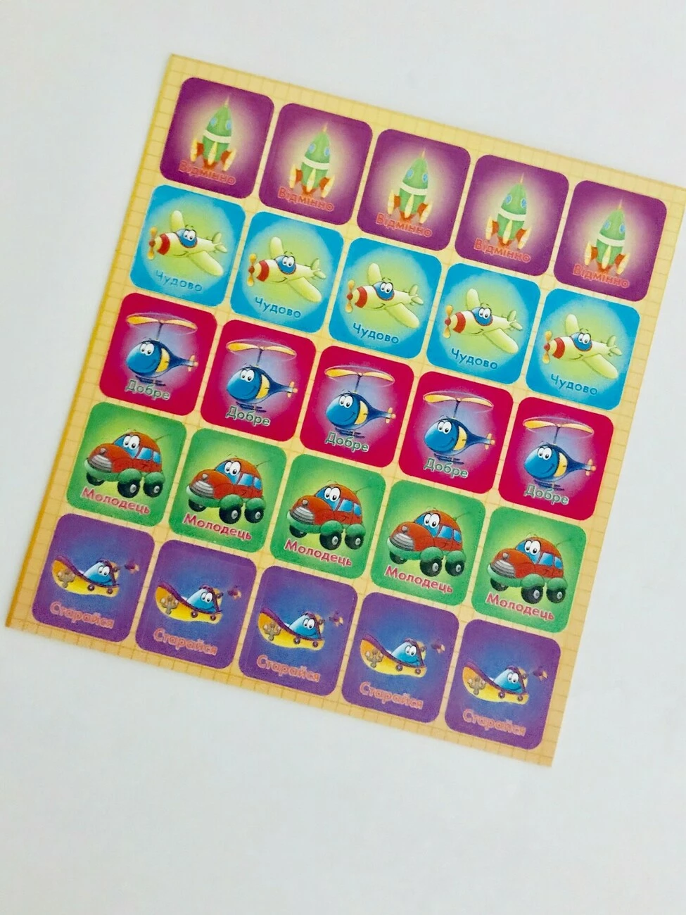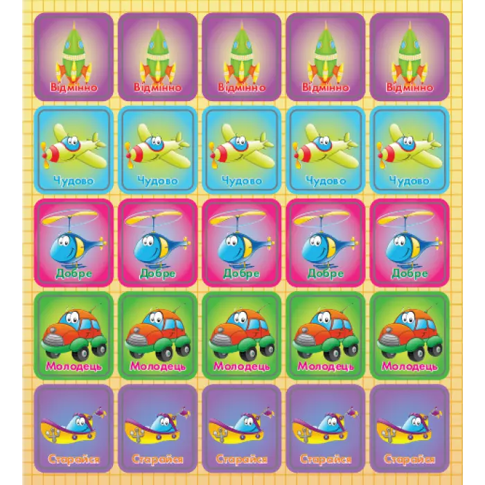Малюки в садку і початковій школі не отримують повноцінних оцінок, а так хочеться похвалитися власними досягненнями у навчанні перед друзями і батьками. Тому вчителі можуть мотивувати і підбадьорювати своїх вихованців і учнів такими чудовими наклейками-оцінками. 25 наклейок з малюнками кубків позначають оцінки відмінно, відмінно, добре, молодець і красиво. Дітям буде цікаво дивувати наставників своїми знаннями і колекціонувати такі позитивні наклейки.