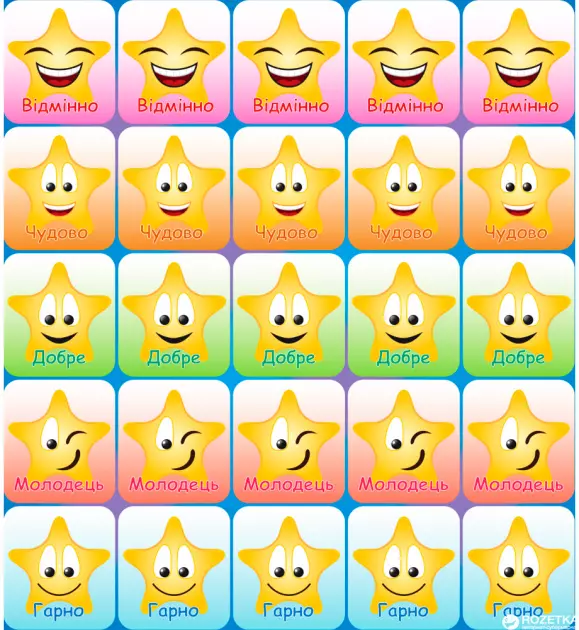 Малюки в садку і початковій школі не отримують повноцінних оцінок, а так хочеться похвалитися власними досягненнями у навчанні перед друзями і батьками. Тому вчителі можуть мотивувати і підбадьорювати своїх вихованців і учнів такими чудовими наклейками-оцінками. 25 наклейок з малюнками кубків позначають оцінки відмінно, відмінно, добре, молодець і красиво. Дітям буде цікаво дивувати наставників своїми знаннями і колекціонувати такі позитивні наклейки.