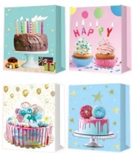 Подарунковий пакет - С 49699 Розмір: 26 х 10 х 32 см. Кількість видів – 4; Тема: день народження; Тип ручки: стрічка; Прикрашений - блискітками, 3D малюнок.