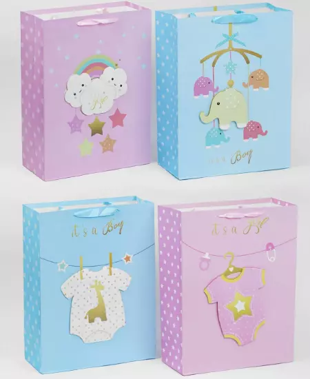 Подарунковий пакет – С 49756 Розмір: 31 х 12 х 40 см. Кількість видів – 4; Тематика: бейбі шауер; Тип ручки: стрічка; Прикрашений - блискітками, 3D малюнок.