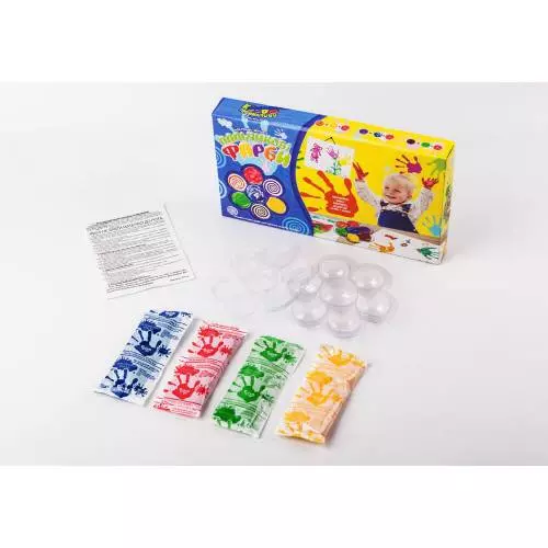 Пальчикові фарби дозволяють помалювати навіть найменшим, використовуючи нестандартну техніку малювання. Яскраві кольори обов'язково зацікавлять малюка, а специфіка цього виду творчості максимально розвиває творчі здібності дитини. Комплект містить: комплект пальчикових фарб; штампик; комплект полімерних наклейок на штампик; палітра; «Живі очі»; інструкція.