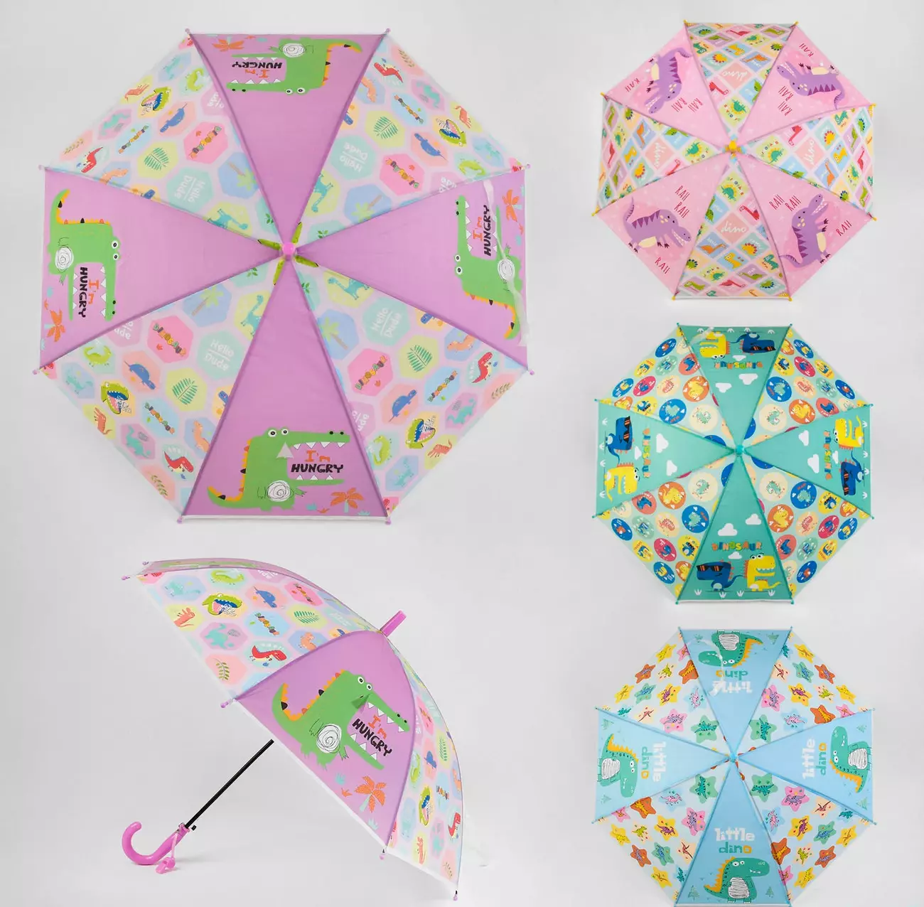 Вид - тростина; Механізм - напівавтомат; Діаметр розкритого купола парасольки - 96 см; Довжина - 66.5 см; Матеріал - пластик, PVC (полівінілхлорид), метал.; Принт на фоні із зображенням динозаврів. Брелок ручка-тримач зі свистком.