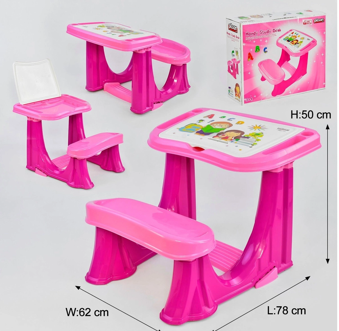 Навчальна парта рекомендована для навчання, дитячої творчості, рольових ігор дітей від 3-х до 10-ти років. Під відкидною кришкою парти розташовується зручний вбудований органайзер для зберігання канцелярського приладдя. Також з боків парти розташовуються поглиблення для ручок і олівців. Лавка і столик складають єдиний корпус і не віддільні один від одного. Дитяча парта має стильний зовнішній вигляд і підходить для установки як в приміщенні, так і на відкритому повітрі. Пластик не має запаху, не викликає алергію і повністю безпечний для дитини. Максимально допустима вага дитини - 50 кг. Вага брутто: 4,2 кг. Вага нетто: 4 кг. Розміри / габарити - довжина (см) 78 см - ширина (см): 62 см - висота (см): 50 см Розмір упаковки: 63 см ? 21 см ? 52 см