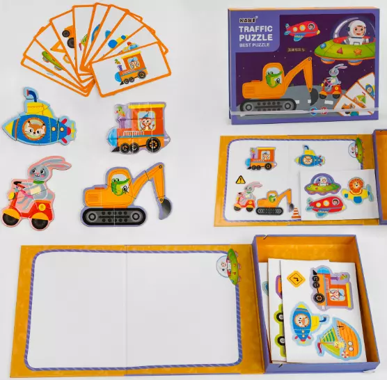 Пазли магнітні С 47881 поєднує в собі захоплюючі магнітні пазли і доладну білу дошку для малювання сухостираємим маркером. Головна особливість моделі - компактність, адже всі елементи гри складаються в одну яскраву коробочку, яка є дошкою для малювання. Ігровий набір підходить дітям від 3-х років. Він стимулює сприйняття кольору, розвиває тактильні відчуття та сприяє покращенню просторового та логічного мислення. У набір входять 4 аркуші магнітних пазлів із зображенням різних тварин у транспорті, а також 10 карток із завданнями. Комплектація: - коробочка з магнітною дошкою; - магнітні пазли; - 10 карток.