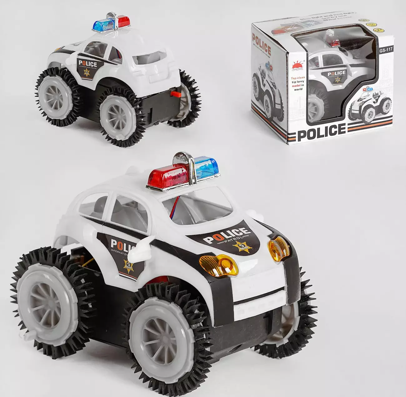 З поліцейською машинкою перевертишем GS - 117 Ваш малюк раз і назавжди зможете забути про нудьгу! Завдяки великим об'ємним колесам, машинка з легкістю долає будь-які перешкоди, їй не потрібно нічого об'їжджати вона рухається тільки вперед, а якщо і падає, то самостійно встає за кілька секунд. Придумуйте дивовижні маршрути, ставте на дорогу перешкоди, тестуйте колеса на різних поверхнях і звичайно ж дивуйтеся все новим і незабутнім трюкам. Машинка працює від 2-х батарейок типу "АА" - в комплект не входять.
