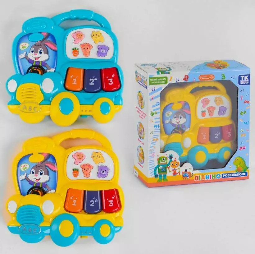 Дитяче музичне піаніно у формі кумедного автобуса з веселим зайчиком за кермом стане чудовою іграшкою для малюків віком від 18 місяців. Вже з перших секунд знайомства з новою іграшкою, дитина буде підкорена її милім дизайном, функціональними особливостями та ритмічними мелодіями. Іграшка допомагає дітям розвивати сприйняття кольорів, звуків та форм, тренує дрібну моторику, вчити зосереджуватися на певній дії, запам'ятовувати порядок натискання кнопок. Особливості: - відповідає технічному регламенту безпеки іграшок; - виконане з якісних матеріалів; - українське озвучування; - піаніно має кілька режимів звучання; - оснащене підсвічуванням; - працює від 2-х батарей АА (не входять до комплекту); - легка та яскрава конструкція іграшки налічує 8 активних кнопок, які відтворюють різні звукові ефекти: мелодії, пісні, цифри; - 2 рівні регулювання гучності; - цікавий та привабливий дизайн, приємні оку кольорові поєднання.