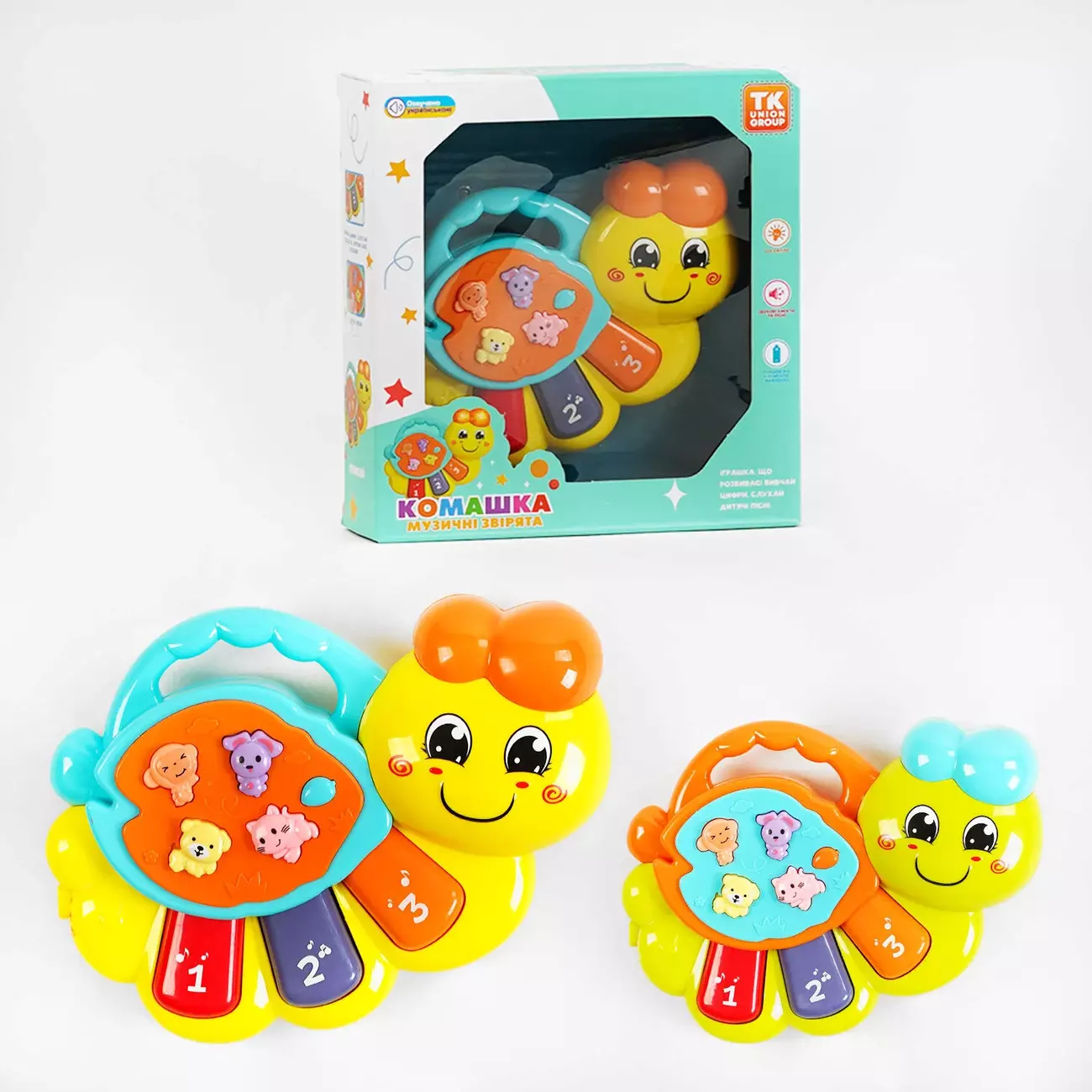 Поринь у цікаві музичні пригоди разом з милою комашкою! Захоплююча розвивальна іграшка від "TK Group" розкриває перед дітьми чарівний світ веселощів та мелодій. Доброзичлива та весела комашка запрошує пограти на барвистому піаніно, послухати пісні українською мовою та веселі мелодії, вивчити цифри. Іграшка сприяє розвитку дрібної моторики, логічного мислення, сенсорно-зорового сприйняття. Особливості: - цікавий та яскравий дизайн іграшки, який захоплює погляд; - кнопка у вигляді листочка активує три режими: 1 режим “Вивчаємо цифри” - при натисканні на клавіші піаніно озвучуються цифри українською мовою; 2 режим “Веселі мелодії” - відтворення різноманітних мелодій при кожному натисканні на клавіші піаніно; 3 режим “Давай пограємо. Зіграй власні мелодії” - при натисканні на клавіші активуються звуки нот. - кнопки у вигляді тваринок відтворюють пісні українською мовою; - світловий ефект у вигляді підсвічування голови; - на іграшковій панелі є регулятор гучності; - іграшка не має гострих кутів; - тип живлення - 2 батарейки “ААА” (не додаються).
