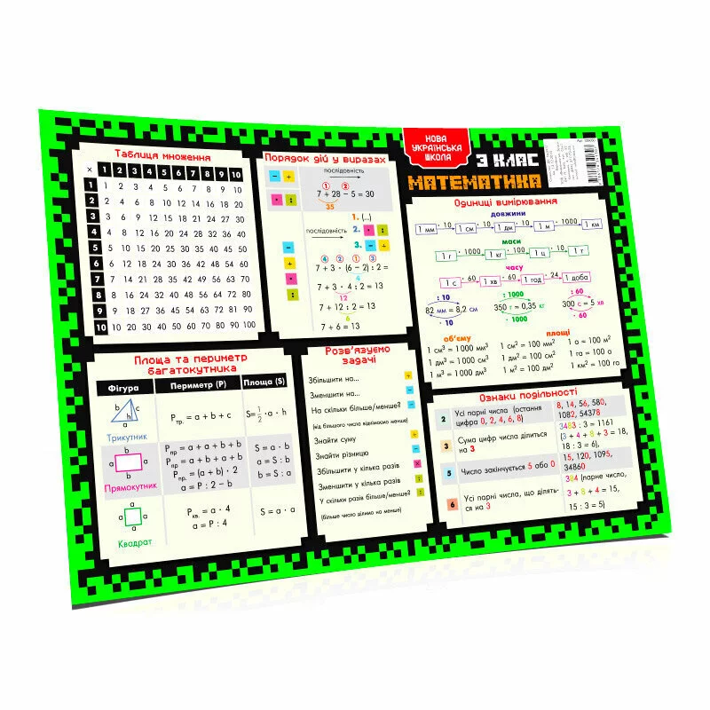 Підкладка-підказка навчальна А3 1/2/3/4 клас – це найважливіша інформація для учнів, яка вивчається у початковій школі і яку потрібно запам’ятати, а ще – це підказка для батьків, які в тій чи іншій мірі допомагатимуть маленьким учням опанувати шкільну науку. Її можна покласти на стіл, помістити в зручне місце так, щоб можна було тримати перед очима важливу інформацію та легко її в разі потреби знайти. Матова ламінація. Розмір 420х297мм