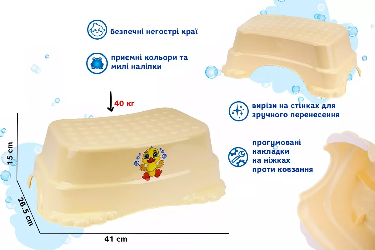 Всі дітки хочуть допомагати батькам та скоріше стати дорослими. Самостійно чистити зуби та причісуватися. Особливо цікаво допомагати на кухні: нарізати, помішувати, ліпити або просто спостерігати за матусею. Але часто стільниця високо і недосяжна для дітвори. Підставка-сходинка стане незамінною помічницею у такій роботі. Її зручно використовувати також у ванній, щоб сідати на унітаз або біля умивальника. Підставка велика, міцна та практична. Має прогумовані вставки на ніжках проти ковзання. Верхня площина з додатковим рельєфом та матовою поверхнею. Рекомендуємо максимальне навантаження 40 кг. Кольори підставок-сходинок в одній гамі з дитячими ванночками, накладками на унітаз та горщиками. Це створить єдину колекцію предметів побуду для малюка, гарно впишеться в інтер'єр ванної та дитячої кімнати. А ще позитивно вплине на сприйняття новинок для дитини, адже вони вже будуть їй близькими та знайомими. Підставка виготовлена з міцного та якісного пластику без запаху, не містить фталатів і BPA. Це означає що виріб не викликає алергію і ваша дитина може безтурботно торкатися та облизувати його. Використання тільки якісних барвників забезпечує яскравий колір протягом тривалого терміну користування