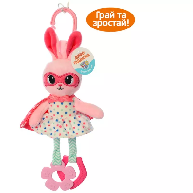 Підвіска на коляску з прорізувачем "Зайчик", розмір 35см. Іграшка приверне увагу малюка. Іграшка розвиває тактильні, слухові та зорові відчуття. Така іграшка стане чудовим подарунком для новонародженої дівчинки і може тішити її довгий час! Матеріал: пластмас+тканина.