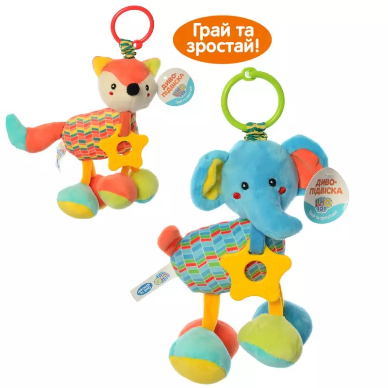 Яскрава і красива підвіска безсумнівно приверне увагу малюка. Він зможе нею грати, пробувати на смак, при цьому у нього будуть розвиватися тактильні відчуття і дрібна моторика. Підвіска представлена у вигляді плюшевої звірятка з пластмасовими рухомими елементами. Розмір - 27-12-9см, Матеріал - пластмаса + тканина