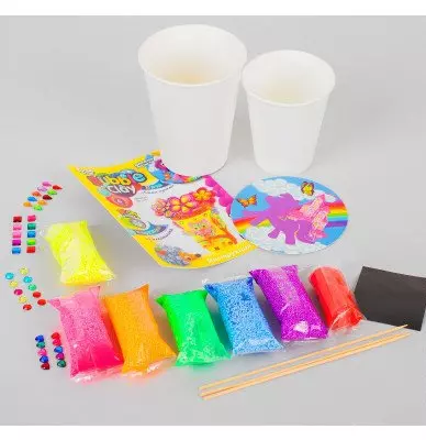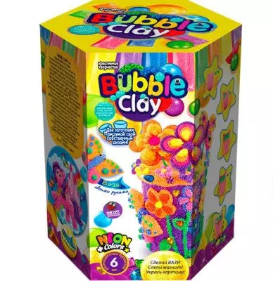 Основа набору – сучасний матеріал для дитячого ліплення: дрібнозернистий шариковий пластилін «BUBBLE CLAY». Кульковий пластилін ідеальний для дитячої творчості. На відміну від традиційного, він не липне до рук та одягу, еластичний, зручний у роботі. Комплект містить докладну інструкцію-ілюстрацію, за допомогою якої дитина самостійно або за допомогою дорослого зможе виліпити вазу з квітами та картину із пластиліну. У комплект розвиваючої гри входять: • різнокольоровий шариковий пластилін (6 шт.); • маса для ліплення; • магнітна стрічка; • дерев'яні палички для створення кольорів; • декоративні кристали; • «живі очки» для створення чарівних тварин; • заготовка для вази та картини із пластиліну.