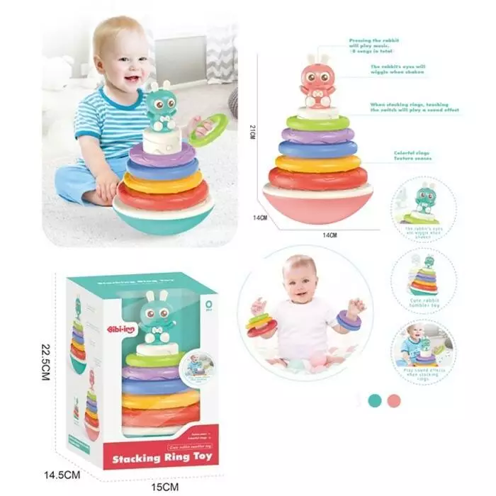 Пірамідка 608-98 неваляшка, кільця 5 шт., зайчик-рухливі очі, 2 кольори, муз.,бат.,кор.,15-23-14,5см