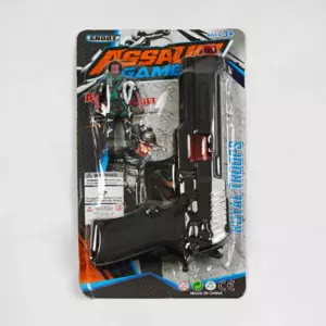 Жодна гра із захопливим сюжетом не обходиться без зброї. Безпечна копія сучасного пістолета приведе хлопчиків у повний захват! Механічний принцип роботи робить зброю цілком безпечною. Достатньо лише натиснути на курок і повітря наповнить звук тріскачки, імітуючий стрільбу. До набору входить ігрова фігура військового з рухливими руками. Особливості: - іграшкова копія сучасного пістолета; - відрізняється легкою вагою; - механічний принцип роботи; - звук тріскачки при натисканні на курок; - до комплекту входить ігрова фігурка військового; - виконаний з первинного пластику, який відрізняється міцністю.
