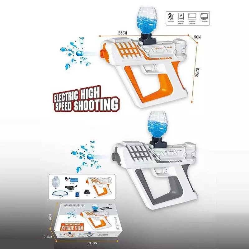 Така футуристична зброя стане в пригоді не тільки космічним піратам та поліціянтам, але й справжнім поціновувачам пригод. Адже така іграшка не тільки має стильний вигляд, але й може стріляти орбізами, які додаються до комплекту. Зброя має один режим роботи — безперервна стрільба після натискання на курок. З таким пістолетом можна не тільки відтворити сюжети з улюблених ігор, але й спробувати себе у ролі шукача космічних пригод. Особливості: - розмір пістолета складає 25х18 см; - іграшка виконана у футуристичному стилі; - до іграшки додаються окуляри, орбізи та пляшечка до них; - пістолет працює від акумулятору 7.4 V (додається), який можна підзаряджати за допомогою USB-кабелю (додається); - іграшка виготовлена з якісного пластику, який є безпечним для здоров’я дитини.