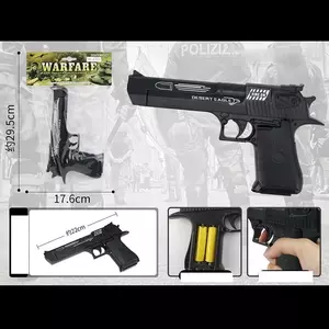 Іграшковий пістолет з потужним корпусом підійде для хлопчиків, які обожнюють ігри з переслідуванням та стрільбою. Цілком безпечна зброя створена для відтворення захопливих сюжетів. Пістолет на батарейках має додаткові ефекти: достатньо натиснути на курок, і пролунають характерні звуки стрільби, а дуло почне підсвічуватись червоним світлом. Особливості: - стильний дизайн пістолета; - додаткові звукові та світлові ефекти: під час стрільби дуло підсвічується червоним світлом і лунають характерні звуки; - виконаний з первинного пластику, який відрізняється міцністю; - додаткові ефекти працюють від 2 батарейок типу АА (до комплекту не входять).