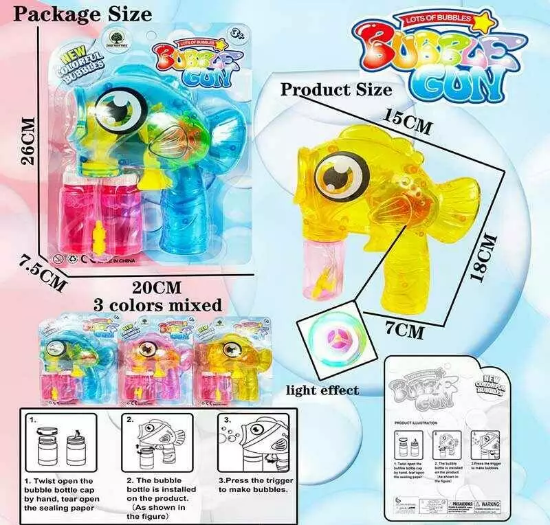 Пістолет з мильними бульбашками JNH 843 (96/2) 3 види, “Рибка”, механічний, 2 пляшечки з розчином, підсвічування, на листі, ВИДАЄТЬСЯ ТІЛЬКИ МІКС ВИДІВ