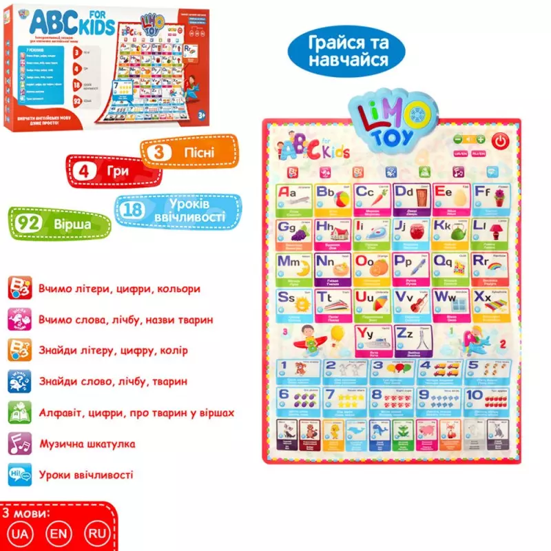 Плакат має 7 режимів вивчення та гри: вчимо букви,цифри,кольори вчимо слова,рахунок,тварин знайди букви,цифру,колір знайди слово,тварину алфавіт,цифри,про звірів у віршах музична шкатулка уроки вічливості. Для зручності вивчення плакат має підказки. Ви самостійно обираєте,якою мовою вам зручні підказки (українською або російською). Діткам також дуже сподобаються: 92 віршика 3 пісні 4 гри 18 уроків вічливості. Тепер точно буде чим зайняти малюка з неймовірною користю для нього. Розмір плакату 55х41 см Упаковка коробка 45х21х3,5 см Працює від батарейок 3 шт ААА (до комплекту не входять).