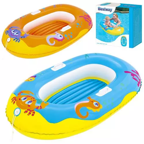 Розрахований на вік від 3-х до 10 років. Довжина – 137 см, ширина – 89 см. 2 міцні ручки. Надувне дно. Буксирувальний шнур. Запобіжні клапани. Виготовлений із міцного, випробуваного вінілу. 2 кольори (жовтий, блакитний). У комплекті – ремонтна латка. У коробці (20-20-6 см)