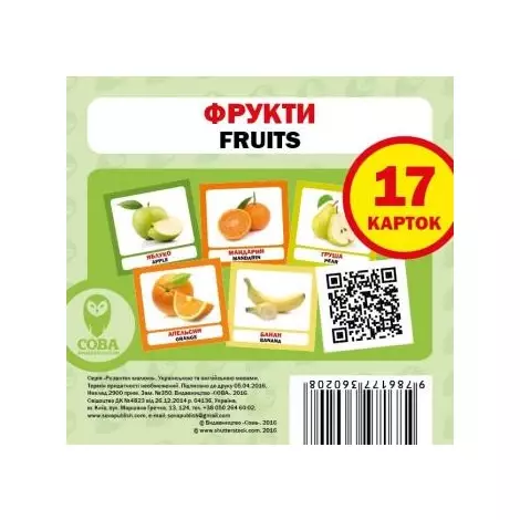 Навчальний набір Сова Фрукти, англ. і укр. буде барвистим і найкращим вибором для подарунка вашій маленькій дитині і його розвитку. З такими барвистими картками, малюк познайомиться з багатьма відомими фруктами, які можна зустріти в будь-якому місці світу. Дивлячись на картки, ви помітите на одній стороні барвисту обкладинку, а на другій стороні намальований фрукт з підписом на українській і перекладом польською. Граючи з нею, ваш малюк отримає незабутні подорожі в світ знань. Робота з картками розширить світогляд вашого малюка, збагатить лексикон і допитливість, комунікативні навички, правильну вимову. Зроблені картки з добре підібраних матеріалів, які не викличуть алергії. Картки допоможуть розвинути в дитині особистісний характер, логічне мислення, фантазію, дрібну моторику рук і комунікативні здібності. Такий набір не буде зайвим для вашої дитини і його подальшого навчання новим іноземним словам. Тип іграшки: Картки навчальні. Матеріал: Картон. Картки Домана: Маленькі (10х10см), Українські, Англійські.