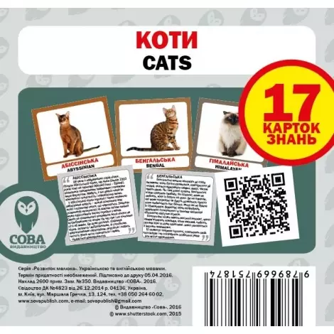 Набір карток Коти англо-український допоможуть розповісти вашим дітям про різноманітні види котів, назв їх порід, і правопис не тільки українською мовою, а й англійською. Завдяки барвисто намальованим картинкам, які зможуть зацікавити будь-яку дитину, і підписів, які в зрозумілій формі пояснять це дитині. При навчанні з батьками у дитини зможуть налагодиться з ними хороші стосунки, що дуже важливо. Досить просто дістати будь-яку з карток і показати дитині, при цьому назвати предмет на різних мовах. Візуальне запам'ятовування є найшвидшим тому ця форма навчання стане найшвидшою. При грі з картками розвивається візуальна пам'ять, логічне мислення, комунікативні здібності. Картки виготовлені з добре підібраних і якісних матеріалів. Лак, яким картки покриті є не токсичним. Тип іграшки: Картки навчальні. Матеріал: Картон. Картки Домана: Маленькі (10х10см), Англійські, Українські.