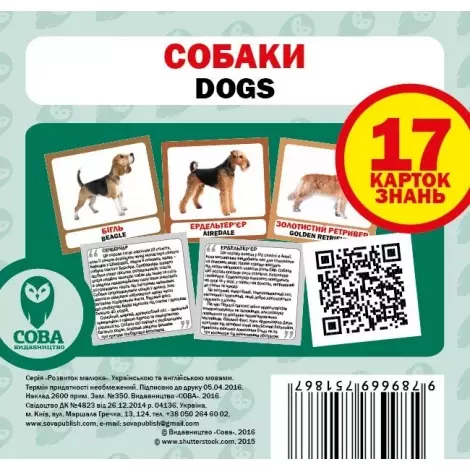 Набір карток Собаки англо-український навчать і розкажуть вашим дітям про різноманітність собак, назв їх порід, і правопису не тільки українською мовою, а й англійською. Все завдяки барвисто намальованим картинкам, які зможуть зацікавити будь-яку дитину, і підписів, які в зрозумілій формі пояснять це дитині. При навчанні з батьками у дитини зможуть налагодиться з ними хороші стосунки, що дуже важливо. Досить просто дістати будь-яку з карток і показати дитині, при цьому назвати предмет на різних мовах. Візуальне запам'ятовування є найшвидшим тому ця форма навчання стане найшвидшою. При грі з картками розвивається візуальна пам'ять, логічне мислення, комунікативні здібності. Картки виконані з міцного картону, так що дитині зігнути їх і порвати буде важко, а не токсичність фарб є великим плюсом. Тип іграшки: Картки навчальні. Матеріал: Картон. Картки Домана: Маленькі (10х10см), Англійські, Українські.