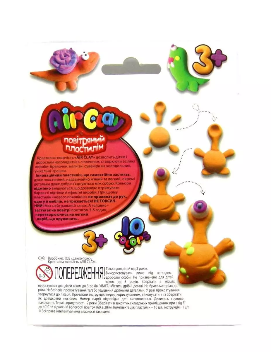 Креативна творчість «AIR CLAY» дозволить дітям і дорослим насолодитися ліпленням, створюючи всілякі вироби: брелочки, магнітні сувеніри на холодильник, унікальні іграшки. Інноваційний пластилін, що самостійно застигає, дуже пластичний, надзвичайно м'який та легкий, окремі детальки дуже добре з’єднуються між собою. Кольори відмінно змішуються, що дозволяє отримувати барвисті відтінки й ефектні вироби. При цьому пластилін «нового покоління» не прилипає до рук, одягу й меблів, не тріскається! Має нейтральний запах. А головне - застигає на повітрі протягом 3-5 годин, перетворюючись на легкий виріб, що пружинить.