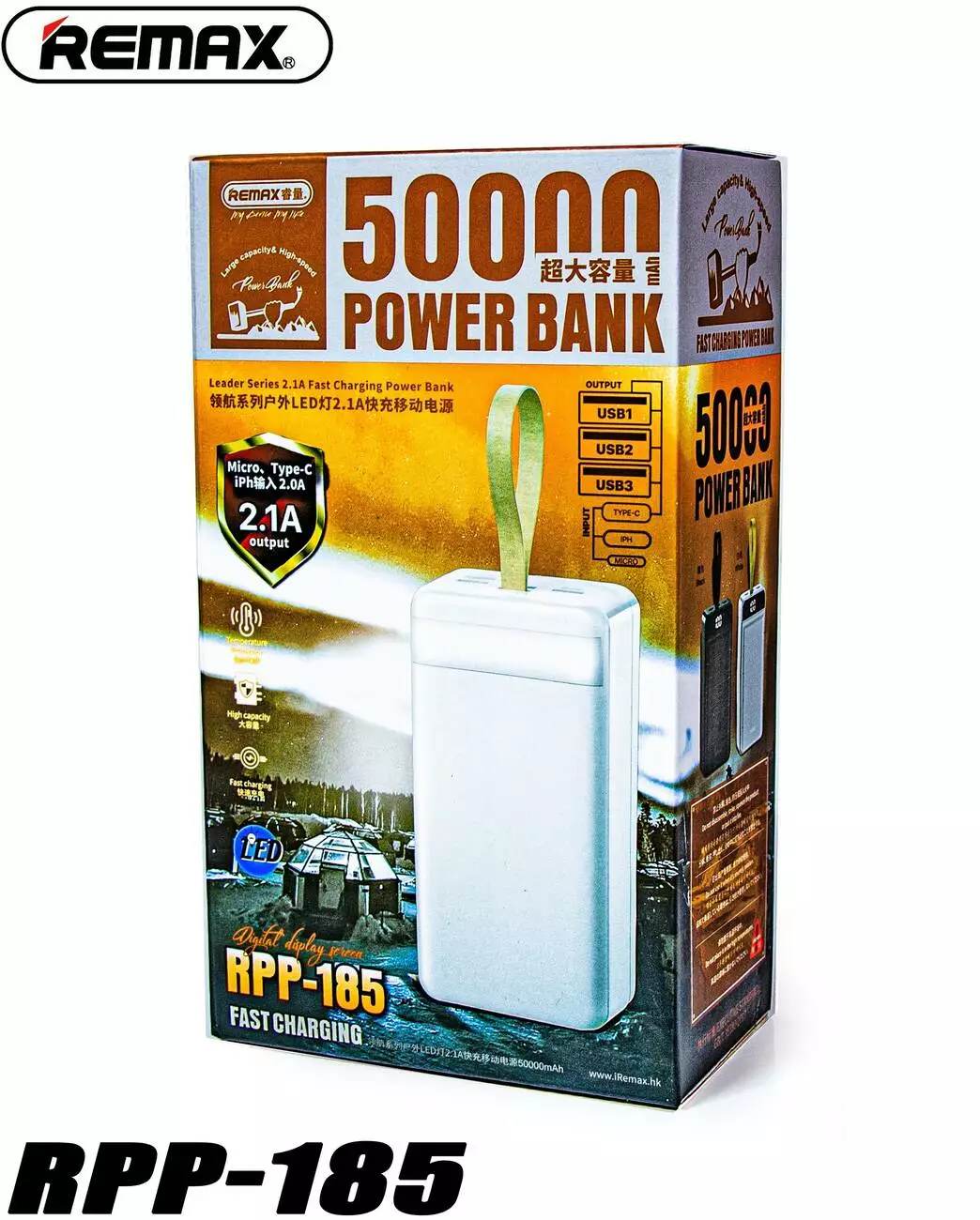 <p>PowerBank REMAX Leader Series Fast Chaging Power Bank RPP-185 50000mAh |3USB/Type-C/Lightning, 2.1A| black</p><br /> <p>Высококачественное портативное зарядное устройство с емкой батареей, которое станет отличным выбором для зарядки гаджетов во время отдыха на природе или длительных поездок. Корпус повербанка надежно собран, изготовлен из прочного сочетания огнестойкого поликарбоната и ABS пластика. В верхней части передней панели аксессуара расположен LED дисплей, защищенный черной глянцевой накладкой и отображающий уровень его заряда в процентах.</p><br /> <p><strong>Достоинства данного Power Bank:</strong></p><br /> <ul><br /> <li>Наличие 3 USB портов для зарядки ваших гаджетов</li><br /> <li>Встроенный фонарик</li><br /> <li>Индикатор уровня заряда (активация кнопкой), вы можете проверить оставшийся уровень заряда в любое время</li><br /> <li>Многоуровневая защита от замыканий и перегревов обеспечивает безопасную зарядку</li><br /> <li>Огнеупорные материалы из которых изготовлен PowerBank</li><br /> <li>Долговечная и энергоэффективная A+ полимерная батарея</li><br /> <li>Красивый и стильный дизайн</li><br /> <li>Возможность заряжать Powerbank MicroUSB, USB Type-C, Lightning кабелем</li><br /> </ul><br /> <p><strong>Характеристики:</strong></p><br /> <ul><br /> <li>Бренд: REMAX </li><br /> <li>Модель: RPP-185</li><br /> <li>Емкость: 50000mAh</li><br /> <li>Тип аккумулятора: Li-Polymer </li><br /> <li>Подключение устройств: 3-USB</li><br /> <li>Вход: Lightning / Type-C / Micro (5V/2A)</li><br /> <li>USB-A 1 / 2 / 3 : 5V/2.1A</li><br /> <li>Материал: ABS + PC огнестойкий корпус + литий-полимерный аккумулятор</li><br /> <li>Размеры: 167 х 82.5 х 51 мм</li><br /> <li>Вес: 1060 гр</li><br /> <li>Цвет: Черный</li><br /> </ul><br /> <p> </p><br />