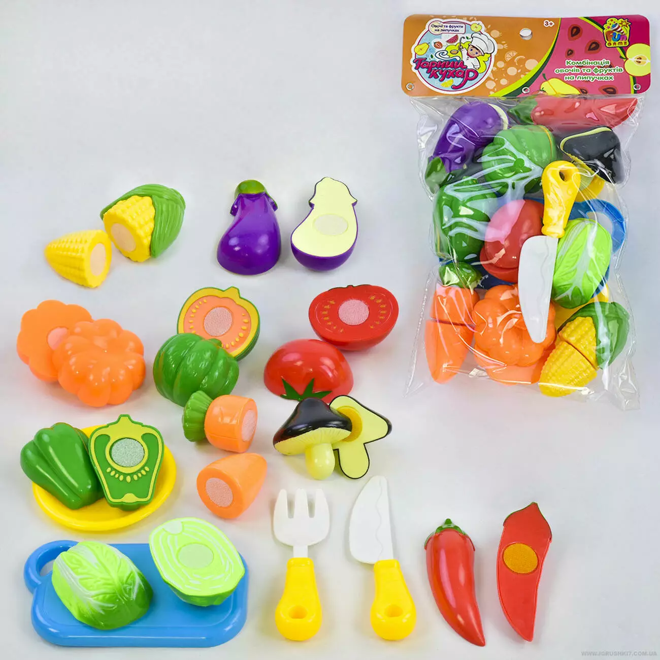 Представляємо вашій увазі набір яскравих пластмасових овочів від Fun Game! Частини продуктів з'єднані між собою липучками. У комплект з овочами входить ніж і дощечка, за допомогою яких дитина зможе "розрізати" їх навпіл. У наборі: - 20 деталей (10 овочів); - ніж; - дощечка; - тарілка; - виделка. Ігровий набір 1020 "Овочі на липучках" дозволить малюкові розвинути дрібну моторику, навчитися навичками роботи з ножем, познайомитися з таким поняттям як частини і ціле.