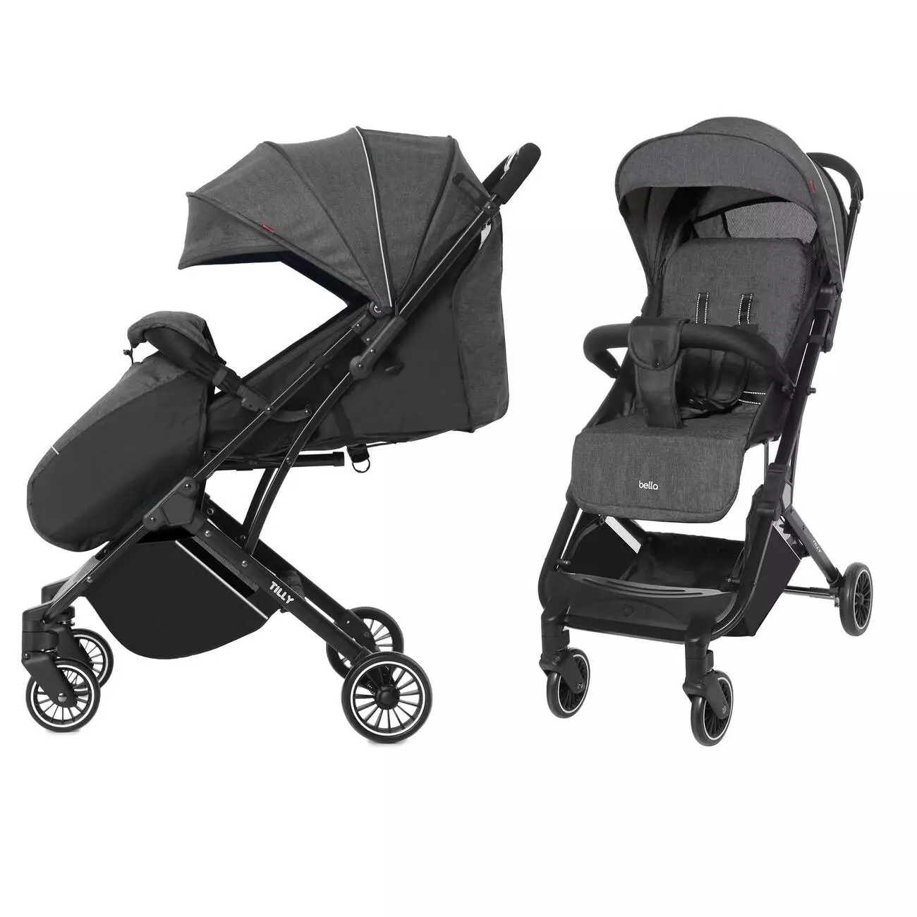 Прогулянкова коляска TILLY Bella передбачає все, що необхідно для комфортних і приємних прогулянок з малюком. Продумана конструкція шасі дозволяє трансформувати модель в компактну форму лише однією рукою. З метою безпеки маленького пасажира, коляска TILLY Bella має п'ятиточкові ремені з додатковими м'якими накладками. Важливо, що крісло оснащене продуманою системою регулювання кута нахилу спинки, підніжкою і зйомним захисним бампером. Від яскравого сонця і вітру дитину вбереже великий капюшон, зверху якого знаходиться невелике оглядове віконце. Комплектація також передбачає місткий багажний кошик, укриття для ніжок.