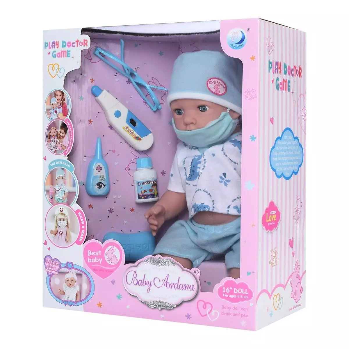 Пупс DH2279B лікар, п'є-пісяє, маска, термометр, окуляри, флакон, кор., 32-38-17,5см.