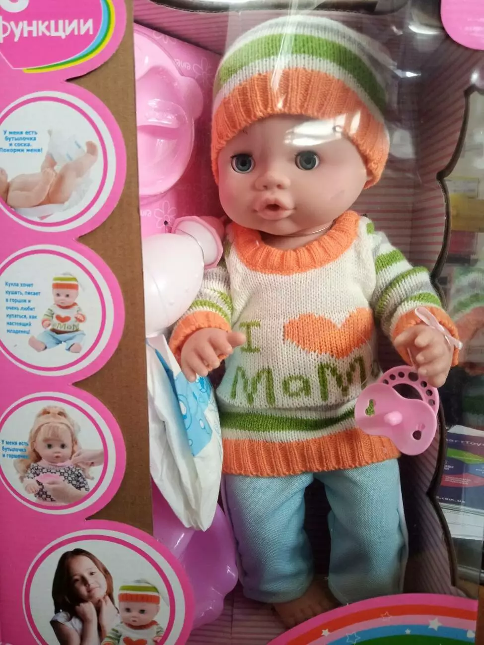 Маленький пупс впевнено приверне увагу дівчаток. Пупс вміє пити, пісяти. У наборі до нього йде ванночка, пляшечка і ін. Аксесуари. Розвиває відповідальність, фантазію, увагу. Країна виробник: Китай. Вік: від 3-х років.