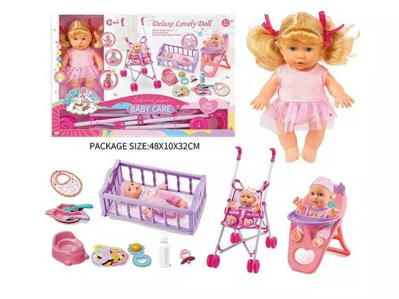 Пупс WZB 669-10 (24) ліжечко-гойдалка, візочок, стільчик для годування, аксесуари, музичний чіп, висота 22 см, в коробці