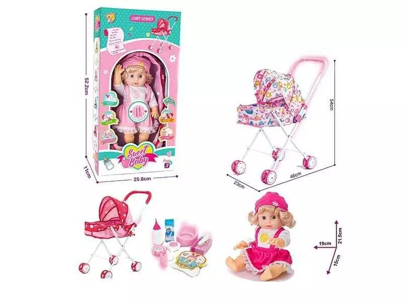 Пупс з візочком 888-14 B (24/2) 2 види, п’є з пляшки, ходить на горщик, музичний чіп, аксесуари, висота ляльки 31 см, в коробці