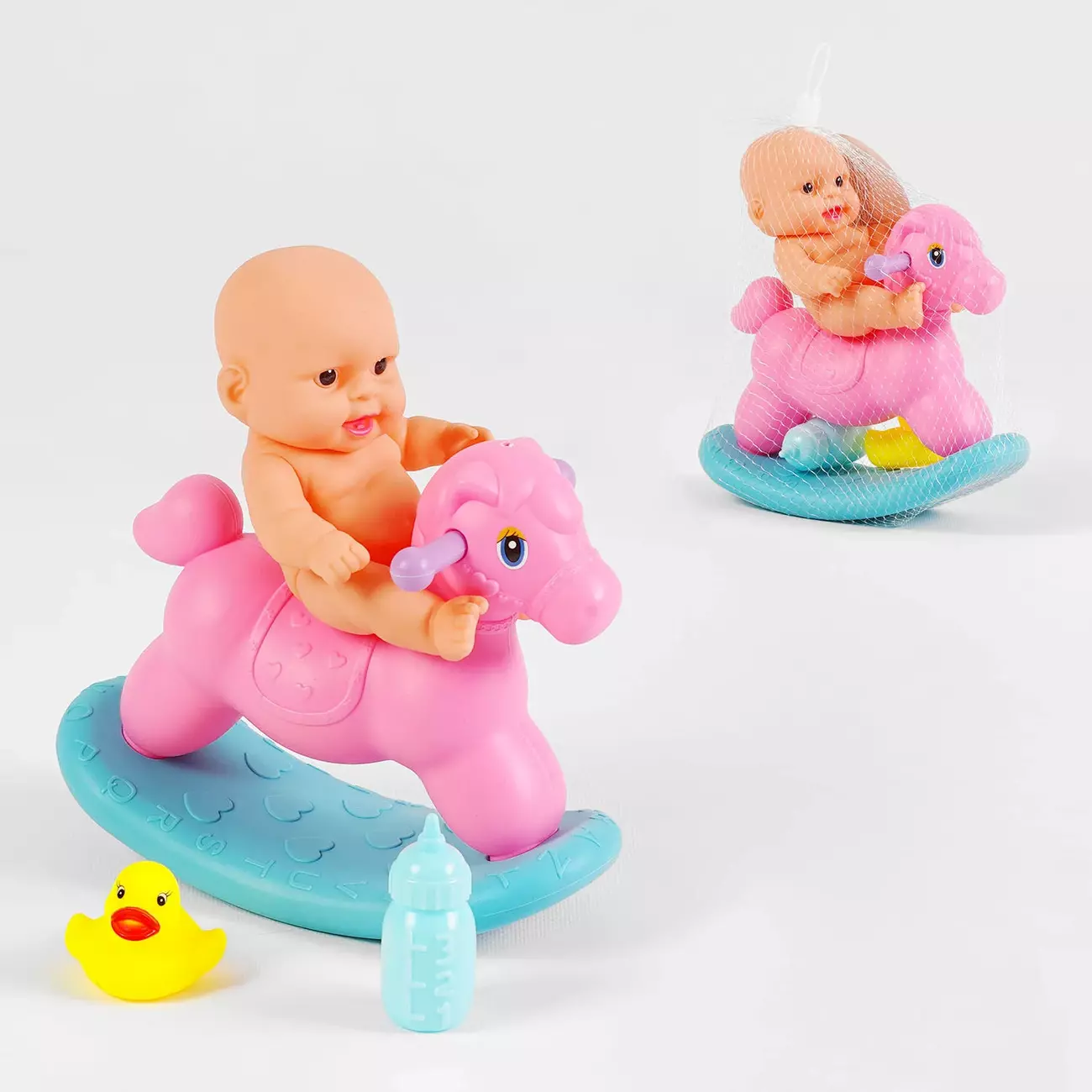 Пупсик з аксесуарами LD 6402 D 61M (96/2) висота 16 см, коник-качалка, пискавка, в сітці