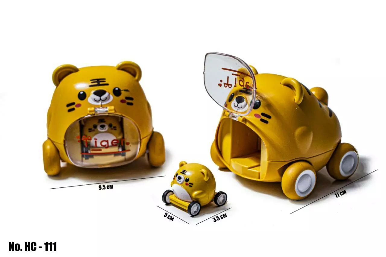 <p>Оригинальная инерционная машинка "Тигр", внутри которой за прозрачным окошком находится миниатюрная версия этой же машинки. Если нажать на хвостик - окошко откроется и миниатюрная машинка выпрыгнет наружу и поедет вперед. Игрушка выполнена из качественного пластика, задние колеса прорезинены.</p><br /> <p><strong>Особенности модели:</strong></p><br /> <ul><br /> <li> симпатичный дизайн, который понравится даже привередливым малышам;</li><br /> <li> машинка изготовлена в форме животного, хвостик которого выполняет роль кнопки;</li><br /> <li> прозрачная крышка животика скрывает внутри точную копию игрушки, но в уменьшенном размере;</li><br /> <li> нажатие на кнопку выталкивает вперед кроху-машинку;</li><br /> <li> машинка оборудована инерционным механизмом;</li><br /> <li> прорезиненные колеса обеспечивают хорошее сцепление с поверхностью;</li><br /> <li> игрушка выполнена из первичного пластика, безопасного для здоровья ребенка.</li><br /> </ul><br />
