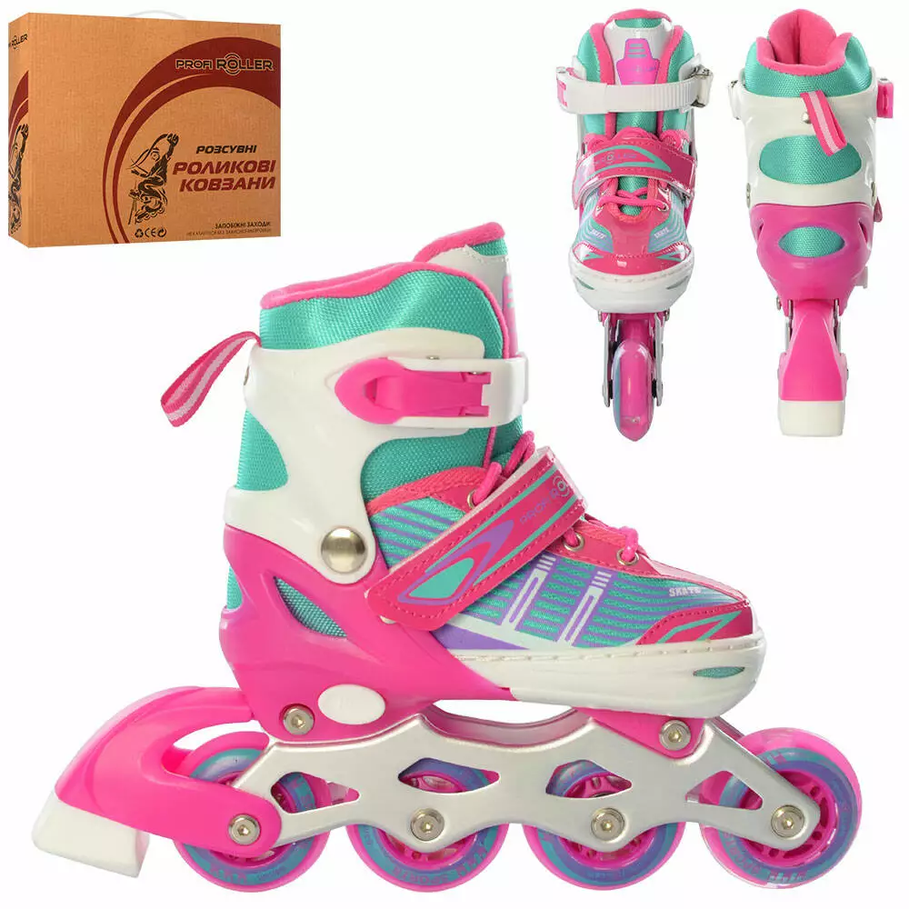 Ролики A 4139-S-P(31-34) розсув.,шнур+бакля,ал.рама,колПУ64мм,1св.,рожево-зелен.,кор.,35-28-10,5см.