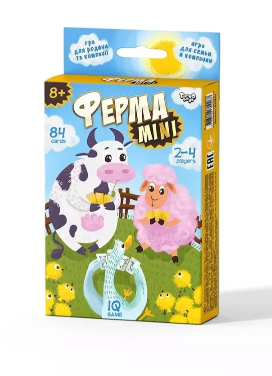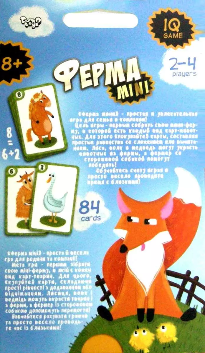Ферма міні G-FM-01 розрахована на веселу компанію з 2-4 гравців у віці від 8-ми років. У наборі Ви знайдете 84 карти та докладну інструкцію до гри. Ферма міні - математична гра, яка у формі веселої та азартної гри допоможе поліпшити розуміння простих математичних операцій. Мета гри - першим зібрати свою міні-ферму, в якій є кожен вид карт-тварин. Для цього "купуйте" карти, складаючи прості рівності зі складанням і віднімання. Лисиця, вовк і ведмідь можуть прикрасити тварин з -Фери, а фермер зі сторожовою собакою допоможуть перемогти! Навчайтеся рахунку граючи і просто весело проводите час.